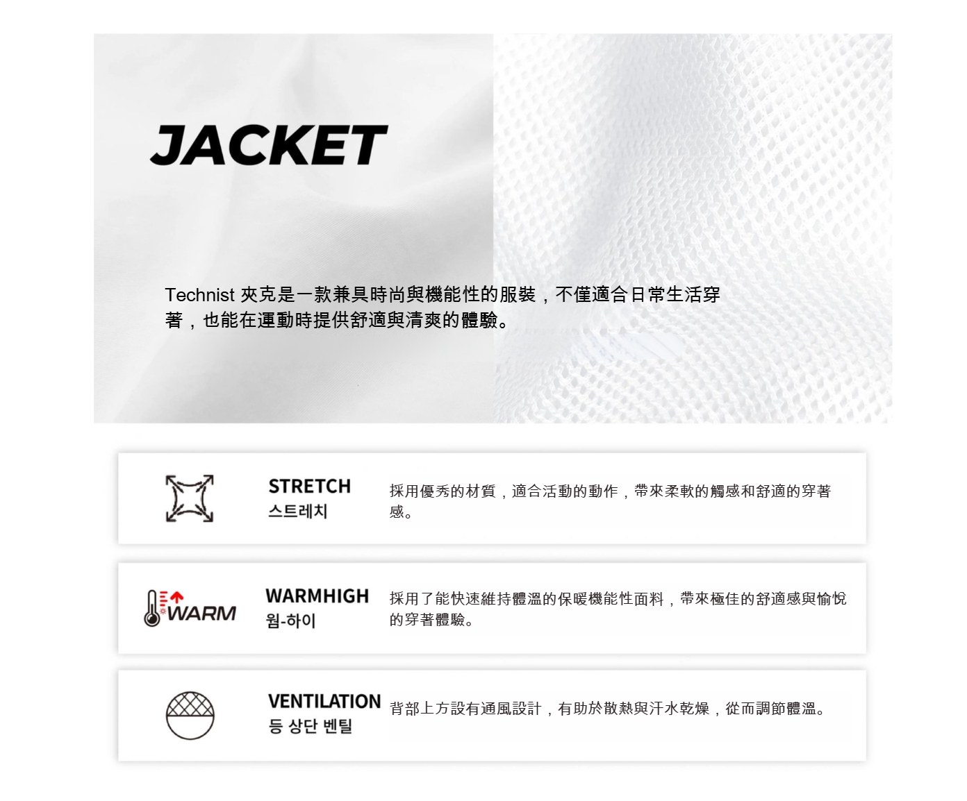 物料 : - Outer Fabric: Polyester 94.6% + Spandex 5.4%